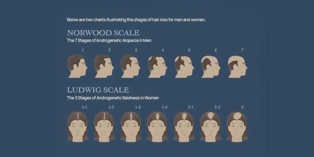 The Norwood Scale or the Ludwig Scale is used to classify and measure the extent of baldness on men and women, respectively. It serves as a visual framework that classifies the progression of hair loss throughout the area of the scalp, and how many hairs would be transplanted.